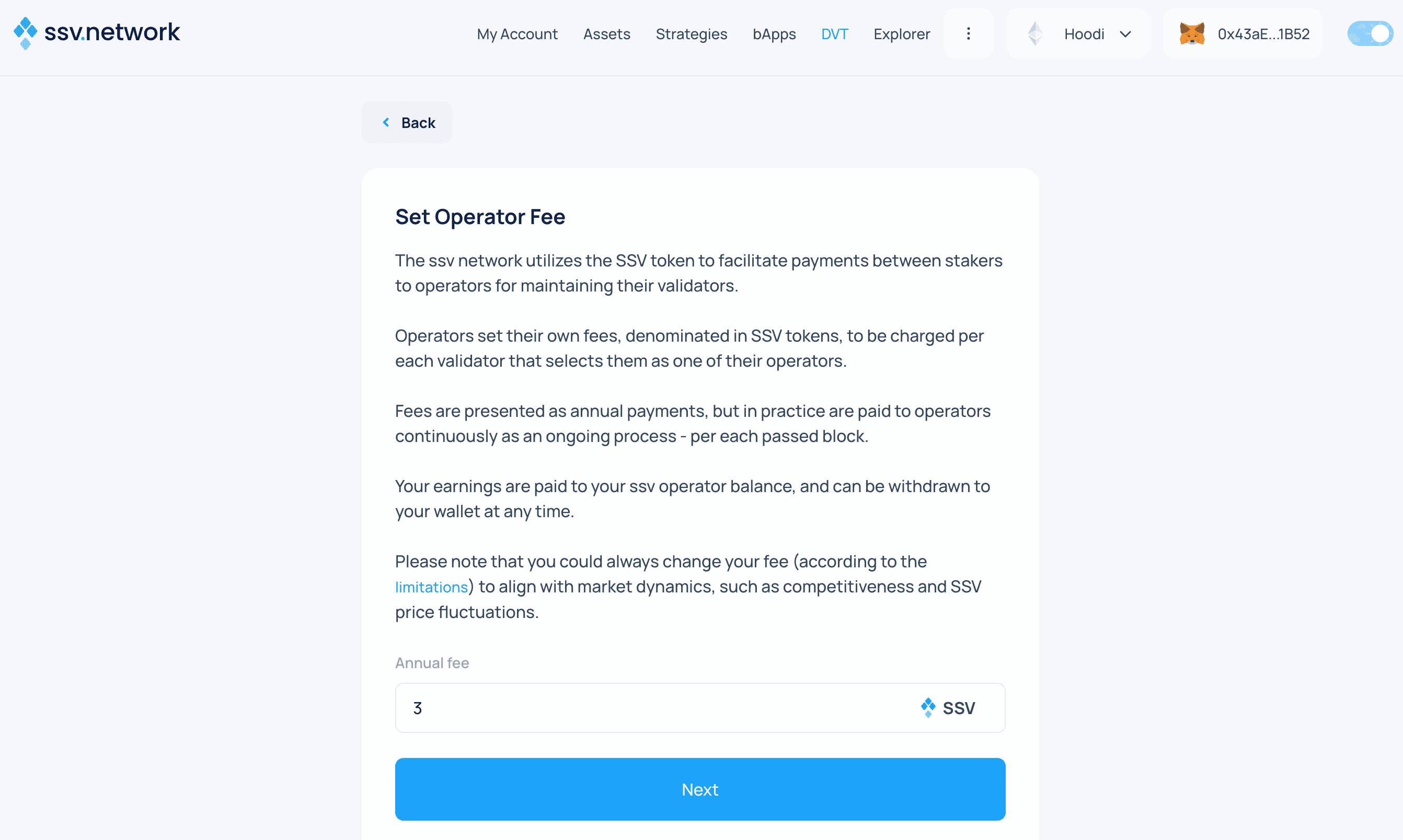 Your fee (in SSV tokens) is charged per validator that selects you. Earnings accumulate in your balance and can be withdrawn anytime. You can update your fee later—decreases take effect immediately, increases require a waiting period to protect stakers ↗.